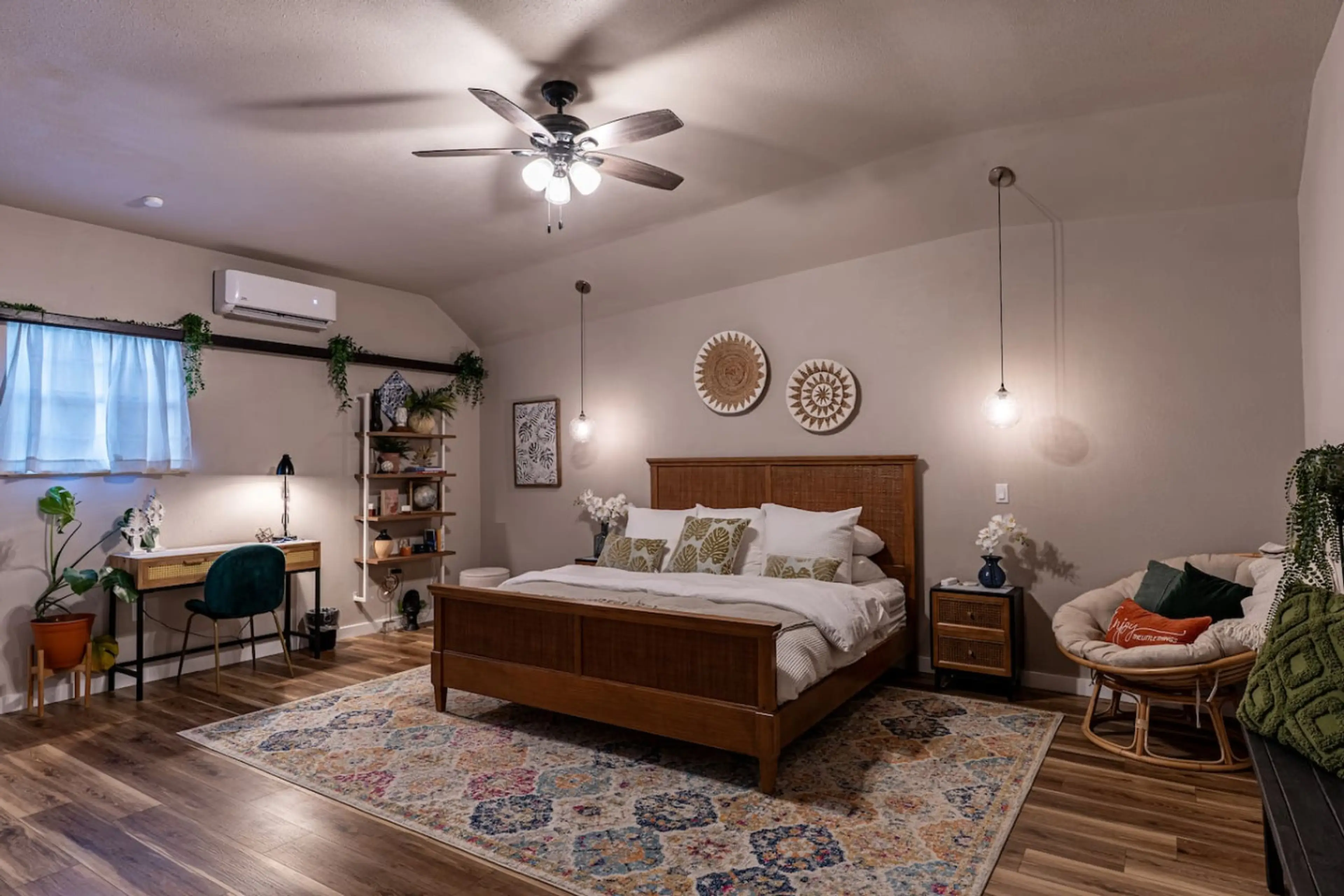 Discover the charm of our Mediterranean-style bungalow on 32 acres in the TX countryside. Mornings are best on the patio w/ coffee while watching wildlife, and evenings invite relaxation by the firepit. Ideal for outdoor enthusiasts, nature lovers, and peace seekers, you can explore serene ponds for...